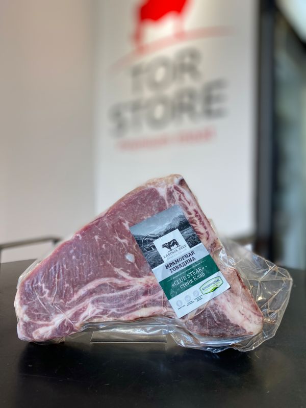 Клаб стейк – это стриплойн на большой т-образной кости: постное мясо с небольшими вкраплениями жировых прослоек и боковой полоской жира. Клаб стейк – это отрез от большого отруба шортлойн в спинной части, толщиной от 2,5 см, но не более 4 см. Говяжья кость плотно примыкает к мышце и придает готовому блюду яркий и насыщенный аромат. Это премиальное мясо с самой высокой степенью мраморности, которая обеспечивает стейку нежную текстуру и превосходный аромат. Мраморной говядине важно вызреть и получить усиление естественного вкуса без процесса маринования, а за счёт биологии, на клеточном уровне, и чем дольше она это делает, тем становится более сочной и мягкой. Перед тем как приготовить этот стейк, мы рекомендуем сделать надрезы вдоль кости, чтобы отделить от неё мясо, это поможет избежать недожарки на сковороде или гриле, а степень прожарки medium рекомендуем контролировать по стриплойну.