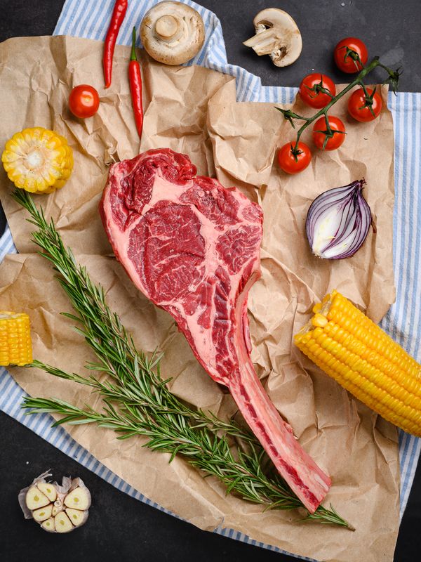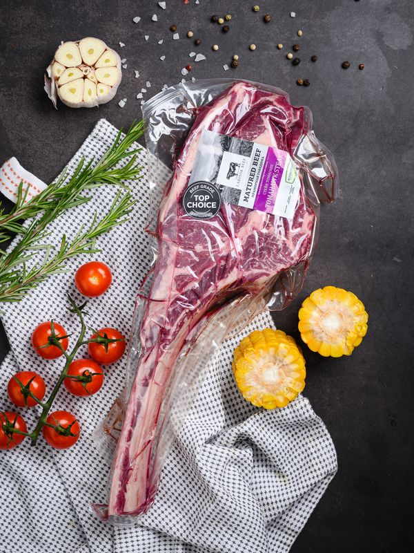 Стейк Томагавк — это Рибай на кости. При жарке кость придает стейку восхитительный говяжий аромат и отличительный вкус, а мясные прожилки, соединяющие кость с мясом имеют яркий вкус, который не найти у других стейков.